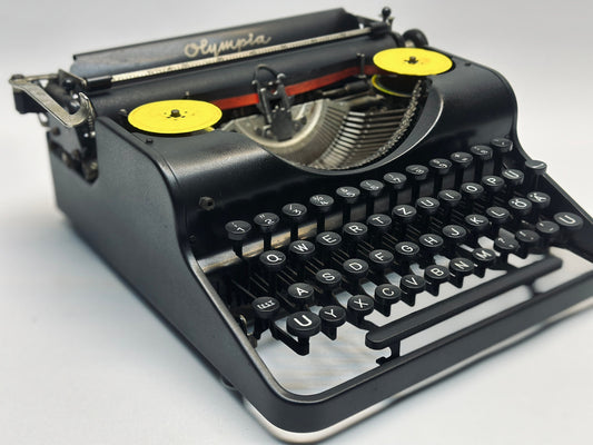 Olympia Black Typewriter - 1940 Model, Impeccable Performance, QWERTZ Keyboard - A Timeless Writing Companion with Black Wood Bag