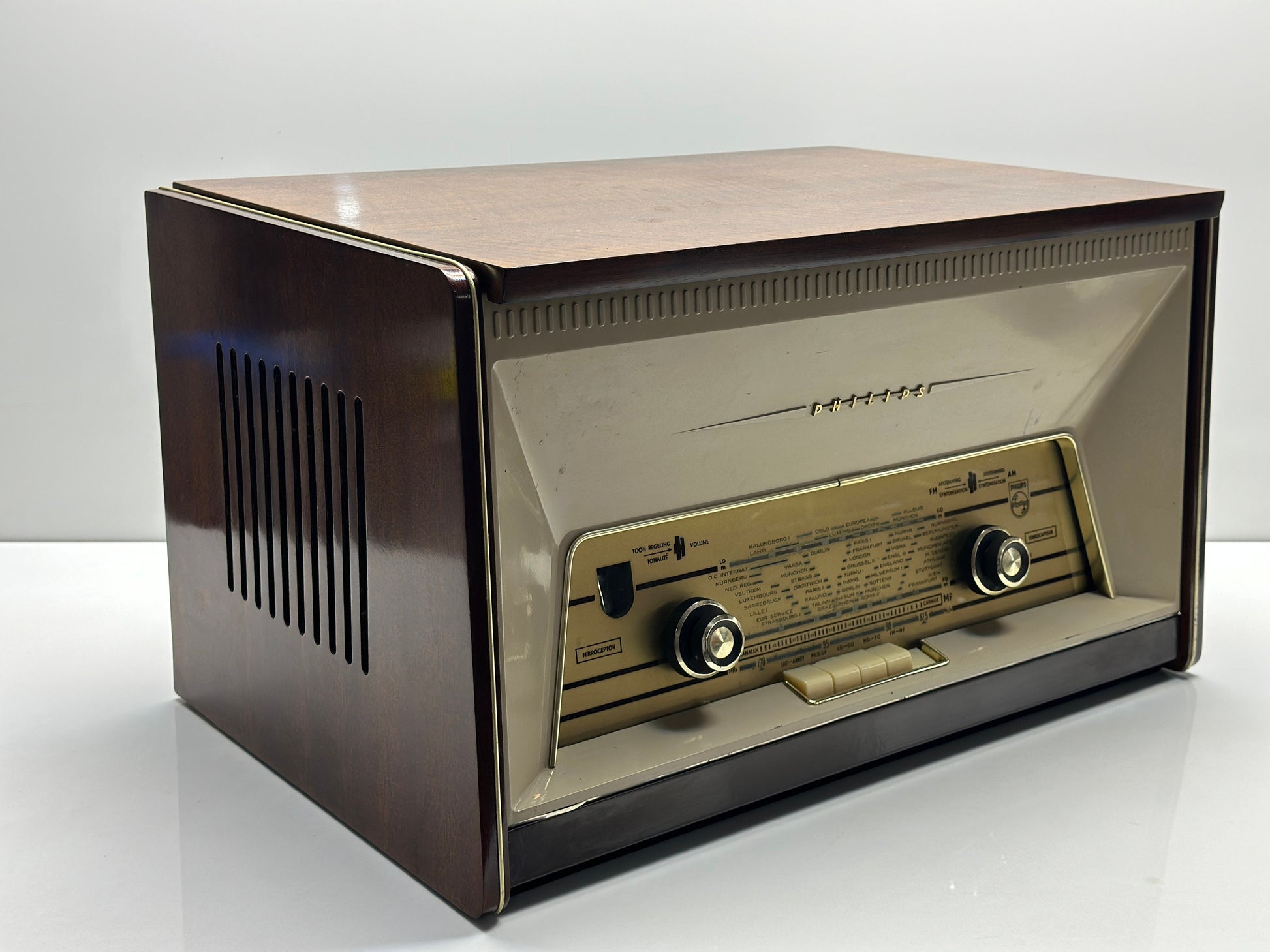 The Antique Philips Radio and Record Player has been expertly refurbished, ensuring flawless performance and a seamless blend of aesthetics and functionality.